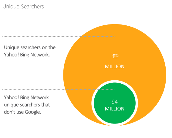 2)必應+雅虎的用戶中有19.3% (9400萬)的搜索用戶不使用Google,這些用戶只能通過必應+雅虎才能觸達。在美國,微軟和雅虎月搜索請求達60億次,占市場近1/3。月覆蓋用戶達到近1.6億,達90%。 其中, 4730萬用戶只使用必應和雅虎搜索,而不使用Google。